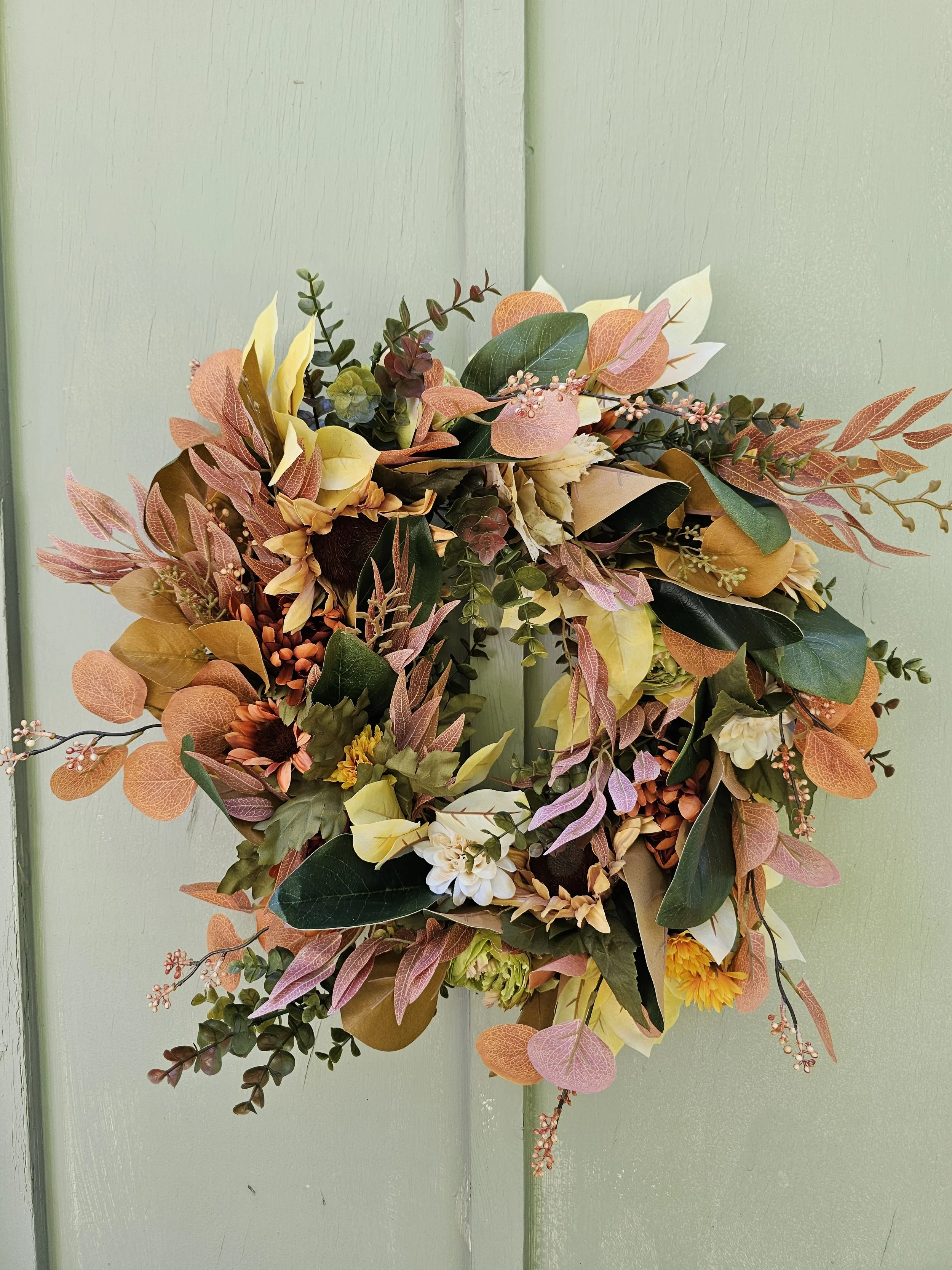 A 16"-18” fully decorated wreath with a full fall color palette of flowers and foliage. Everything from green, yellow, orange, and rust. Heavy emphasis on copper seeded eucalyptus and the golden underside of magnolia leaves.