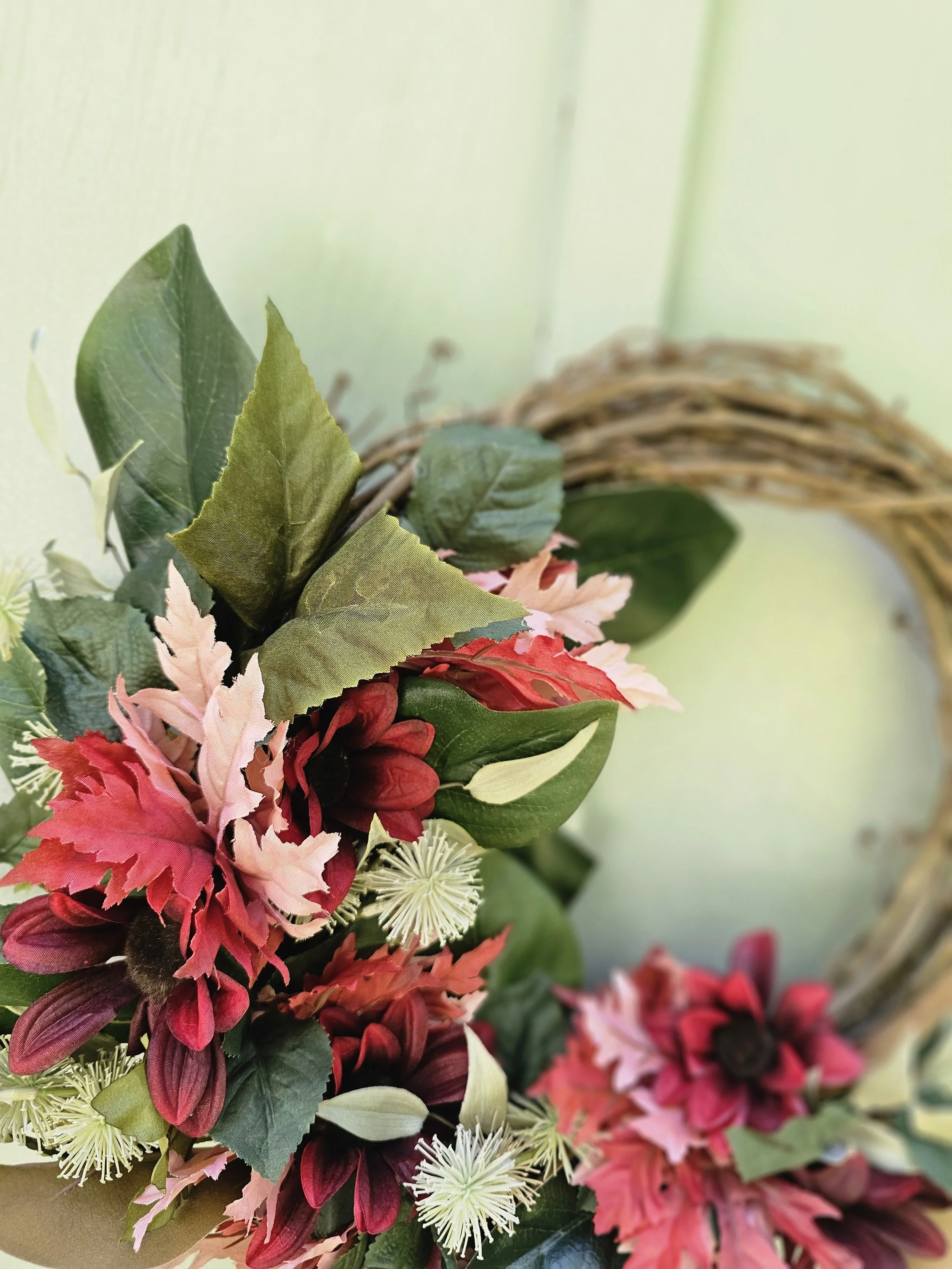 A fall wreath with red maple leaves and fall greenery. The red and green fall color palette transitions great all autumn long through Thanksgiving into December.