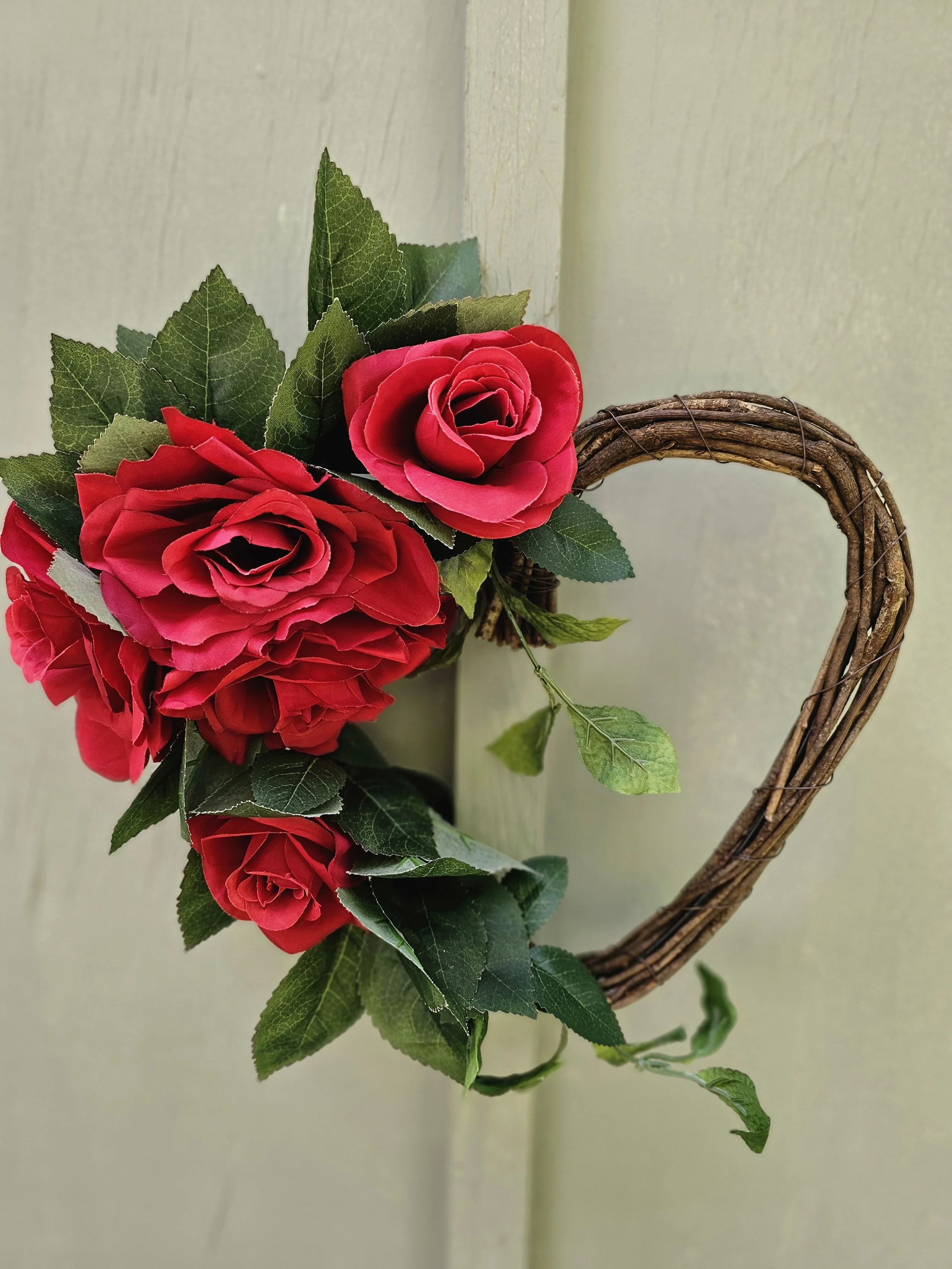 Similar size and shape of our “Red Rose Heart Wreath” but with bigger Rose blossoms and more greenery. Just as romantic yet timeless in its simplicity.